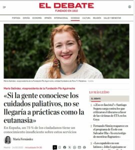 El viernes 14 de febrero la periodista María Fernández de El Debate entrevistó a María Galíndez, vicepresidenta de la Fundación Pía Aguirreche. La periodista tituló la entrevista con esta frase de María: «Si la gente conociese los cuidados paliativos, no se llegaría a prácticas como la eutanasia». En el subtítulo añadió: En España, un 73 % de los ciudadanos tiene un conocimiento insuficiente sobre estos servicios.